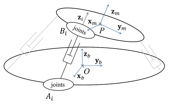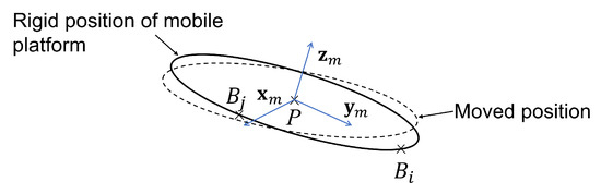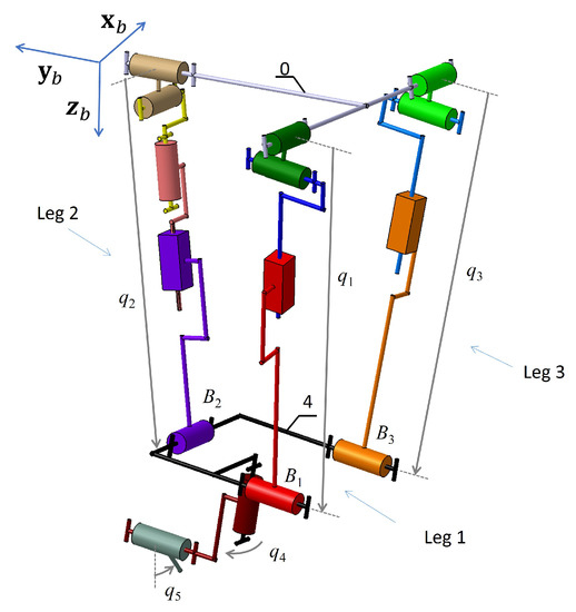 The mobile platform is considered to be rigid for the elaboration of the constraint equations between the leg extremities. We therefore express the movement of the mobile platform due to leg flexibility in stationary configurations of the PKM architecture using screw theory [26] (Figure 5).