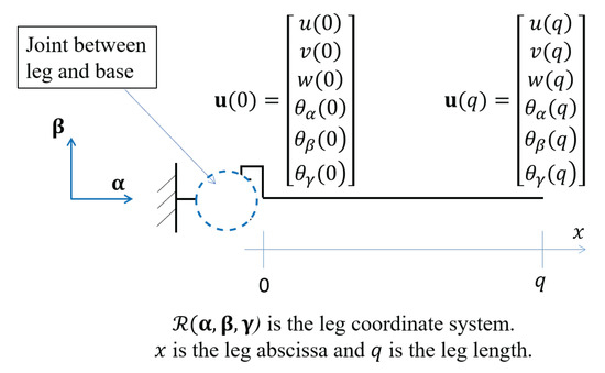 First, each leg is modeled assuming the usual Euler-Bernoulli beam theory. It is worth noting that this model considers the usual mechanical loads, which are bending, traction-compression, and torsion conditions. Each leg is considered to be being connected at one of its ends via a given joint to a fixed part (Figure 4). This boundary condition depends on the joint type used for connecting the leg to the fixed base. In this sub-section, we first study the modeling and the parameter definition of a leg assuming generic boundary conditions to elaborate a leg stiffness matrix and a leg mass matrix in the leg coordinate system. With a generic beam model, leg kinematics are defined through six displacement functions, which correspond to the displacement of the neutral axis. is the vector that collects those displacement functions: