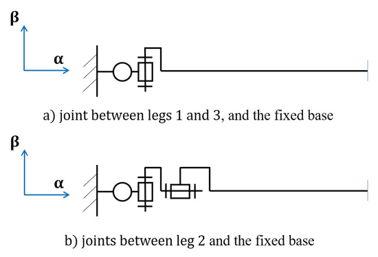 The null nodal parameters of depend on the joint types between the legs and the base as shown in Figure 6. The first joint of Legs 1 and 3 with the base is a revolute joint about -axis, and the second joint is about -axis. Thus, for Legs 1 and 3, infinitesimal and reciprocal screw motion are the following:
