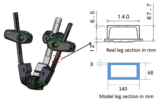 As discussed in Section 2, Tripteor X7 is modeled as a structural assembly of three legs, which link the rigid fixed platform to the rigid mobile platform. The three legs are considered to be steel beams of rectangular cross-section of size consistent with Tripteor X7 legs (Figure 9).