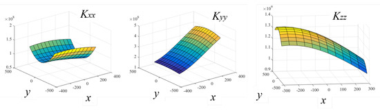 To compute the Cartesian stiffness matrix of the robot at point , the issue is to compute matrix (Equation (29)). Finally, we can compute the stiffness map at a level m for example (Figure 10).