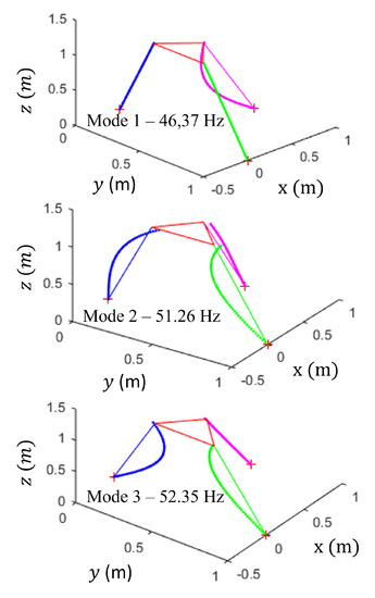 In the literature, previous works studied the modal analysis of the Tripteor X7 PKM architecture using a shaker in three configurations [34] (Figure 13). The displacements of several points of the PKM architecture are measured with accelerometers located on the legs, and on the spindle. Nine DoF are considered for each leg, eight about -axis or -axis and one about -axis, and four DoF for the spindle (Figure 14). The obtained results show four natural frequencies close to 40, 50, 70 and 90 Hz.