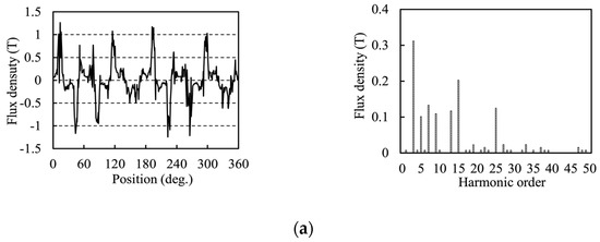 Open-circuit air-gap flux density and harmonic distribution of the four candidates. (a) 12/10 U-core; (b) 12/11 U-core; (c) 6/10 E-core; (d) 6/11 E-core.