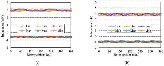 The self-inductance and mutual inductance of the four candidates are given in Figure 7. It can be seen that the waveforms of three-phase self-inductance and mutual inductance are approximately sinusoidal. Both the self-inductance and mutual-inductance of the 11-rotor pole-pairs machines are larger than that of the 10 rotor pole-pairs machines. Due to the single layer winding of the E-core machines, they exhibit less mutual-inductance and larger self-inductance than U-core AFFSPM machines, which indicates a better fault-tolerant operation capability. The smaller mutual inductance symbolizes the good magnetic isolation ability between each phase, which will not cause terrible interference to the remaining phases when a phase fails. Furthermore, the concentrated windings lead to a high self-inductance of each phase, which gives an effective limitation of fault current when the winding short-circuit appears.