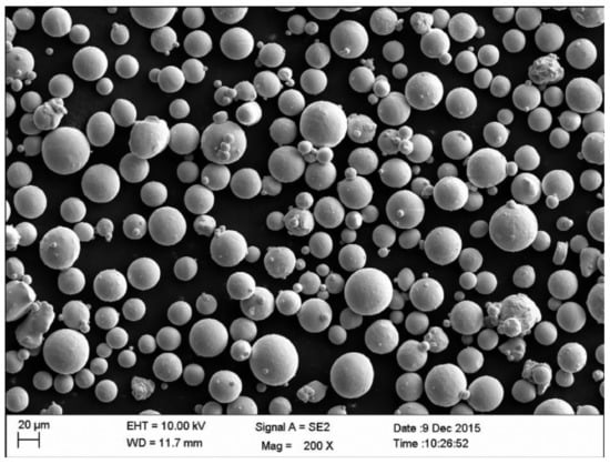 The material used in this experiment is 316L stainless steel spherical powder prepared by the plasma atomization process of Sandvik, Sweden. The bulk density is 3.55 g/cm3 and the tap density is 4.8 g/cm3, which meets the requirements of use. Its specific chemical composition is shown in Table 1. From the scanning electron micrograph in Figure 1, it can be seen that the 316L stainless steel powder used in this experiment has the advantages of high sphericity, less satellite sphere particles, good fluidity, and no segregation of components.