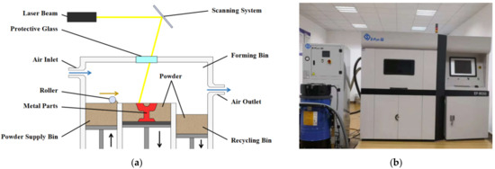 (a) Schematic of laser powder bed fusion forming. (b) EP-M250 equipment.