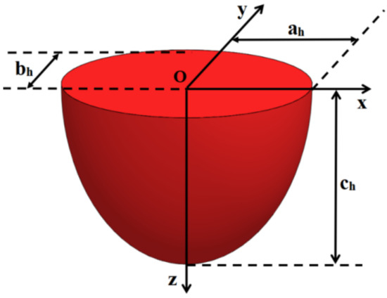 Common heat source models mainly include volume heat source models and surface heat source models. The surface heat source model believes that the laser light source acts on the surface of the powder layer, and then transfers heat to the inside of the powder and the substrate through thermal conduction, while the bulk heat source model believes that the laser will enter the powder through the gap between the powder to heat [29]. Since the energy distribution of the traditional Gaussian surface heat source cannot penetrate deep into the powder bed, the semi-ellipsoidal heat source model can reflect the penetration of the laser in the powder bed; therefore, this article uses the semi-ellipsoid heat source model shown in Figure 3 to replace the traditional surface heat source model [30].