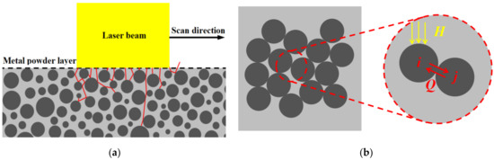 (a) Reflection of laser beam and metal powder. (b) Heat conduction between particles.