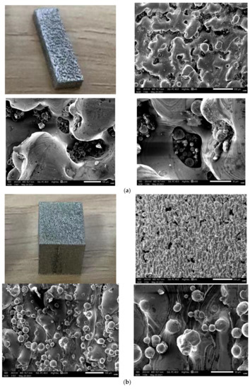 Figure 11a shows a sheet-like stainless steel part printed with unoptimized laser parameters and its scanning electron microscope image. It can be clearly seen from the physical picture that the surface of the sheet-shaped stainless-steel parts is rough and there are a lot of pores inside. From the electron micrograph, it can be seen that there is obvious layering and partitioning on the surface of the sheet-shaped stainless-steel parts, with a large number of cracks inside, and the overall density is not high; at the same time, there are some unmelted metal powder particles inside the pores.
