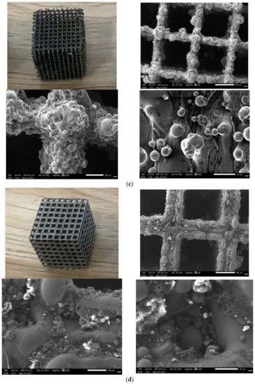 Figure 11c shows a porous stainless-steel part printed with unoptimized laser parameters and its scanning electron microscope image. It can be seen from the physical picture that there are obvious burrs on the surface of the porous stainless-steel parts. From the electron microscope image, it can be clearly seen that the radial dimensions of the porous stainless-steel parts bracket are obviously different, the surface is very rough, there are obvious cracks and recesses at the junction of the vertical and horizontal brackets, and there are more metal powder particles that are not completely melted attached to the stent, and the overall density is lower.