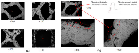 Figure 12 shows a scanning electron microscope image of the section of the porous stainless-steel part optimized in Figure 11e; it can be seen that more obvious defects and cracks have occurred in the central area of the structure. The main reason for this phenomenon is that during the laser powder bed fusion molding process, the laser heat source scans quickly and releases a large amount of heat, and the area scanned by the laser heat source will complete the melting and solidification reaction in an instant. therefore, there is a large temperature gradient phenomenon in the scanning area; if the temperature gradient is too large, it will cause the parts to crack, warp, and deform due to the influence of thermal stress during the molding process.