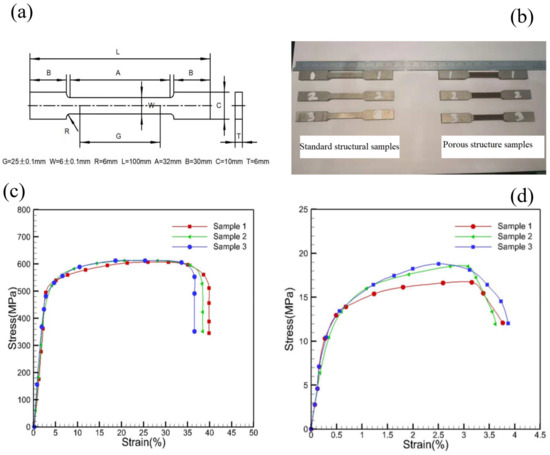 Tensile property test of samples ((a) structure of test sample; (b) printed tensile samples; (c) tensile test results of standard structural samples; (d) tensile test results of porous structure samples).