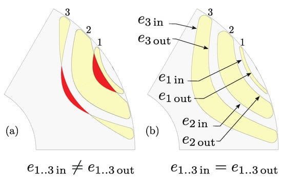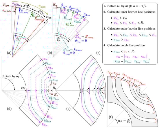 The final step is the rotation around the center point by the angle . Barrier fillets (, Table 1, 12–17) responsible for securing mechanical integrity of the rotor are added to the geometry, and final rotor geometry is exported as to the FEA tool (Figure 4f). Adding precise fillets to the discrete lines is a complex problem which is planned to be explained in the future publications. Detail barrier construction steps from Figure 4b–d are discussed in the following sections.