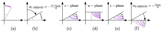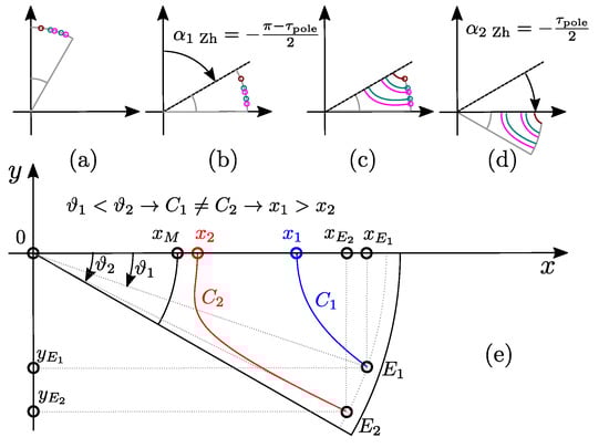 The first step is the calculation of GetZhukLines barrier line function (Algorithm 1: ln:7) based on and number of barriers k. Note that there are no depth parameters. By definition Zhukovsky barriers are streamlines which cannot mutually intersect. Barrier line profiles (Figure 6e) are derived from conformal mapping theory and the Zhukovsky airflow potential formulation [14,15]. This was originally developed to describe the flow paths of fluids channeled by two infinite plates forming an angle , and a plug centred at the origin of the reference frame. In the solid rotor context, the plug represents the non-magnetic shaft with a radius of . Equations Algorithm 1: ln:12 and Algorithm 1: ln:17 express the magnetic field potential lines in parametric form [7].