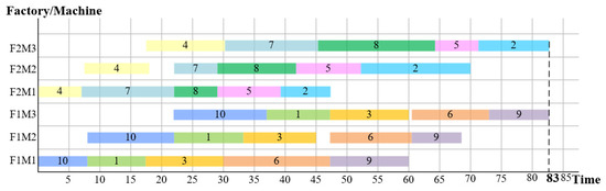 Firstly, we refer to the mixed integer linear programming (MILP) model presented by [38] and use the software CPLEX to solve for an optimal solution to the example without considering deteriorating effects and PM activities. As shown in Figure 1, Job 10, Job 1, Job 3, Job 6 and Job 9 are sequentially assigned to Factory 1, and Factory 2 needs to manufacture Job 4, Job 7, Job8, Job5 and Job 2 in sequence. In this allocation model, the maximum completion time for each factory is 83, which also implies an optimal makespan of 83.