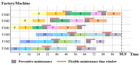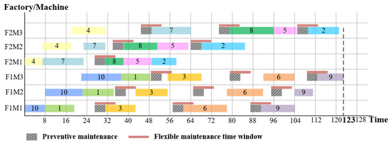 Next, deteriorating effects and PM are considered in the DPFSSP, however, we do not change the optimal scheduling of the original DPFSSP and only insert the proposed flexible PM constraints into the optimal scheduling considering deteriorating effects. As shown in Figure 2, the processing time of the job is extended as long as a machine’s age at the start time of processing the job is not zero. For instance, the deteriorating processing time of the Job 1 of F1M1 can be calculated by , in which 10 is the normal processing time, 0.1 denotes the deteriorating rate, and 8 is the machine’s age immediately prior to Job 1 of F1M1. It is also observed that the insertion of PM activities disrupts the initially tight schedule. There is a lot of idle time resulting from machine unavailability, which causes a longer makespan. Specifically, take F1M2 as an example to illustrate this phenomenon.