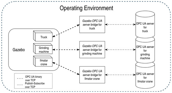 The operating environment represented the physical counterpart of the system. This physical counterpart mimicked a part of a smart factory and it consisted of a crane, a grinding machine, and a truck. The operating environment was created using Gazebo, Gazebo OPC UA server bridge, and OPC UA servers, as seen in Figure 2. The operating environment was not modified when the control implementation of the system was changed.