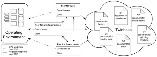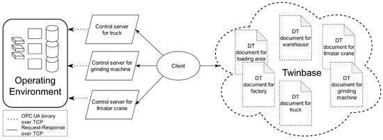 Twinbase, hosted in GitHub, was used to host DT documents. In all the implementations, the controlling unit or units requested necessary DT documents from the Twinbase for static information such as an IP address or available commands. On the other hand, the controlling unit requested dynamic information from OPC UA servers or control servers. Dynamic information contained, for example, the status of a machine or its location. Section 3.2 presents details on information available within the DT document.