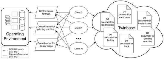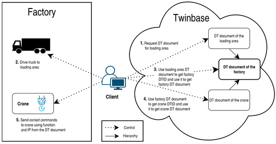 Figure 6 demonstrates the usages of Twinbase in practice. The first client requests the DT document for the loading area from Twinbase. After that, the client gets the loading area’s location from DT documents and sends this as a target value for the truck’s drive function. After the truck arrives at the loading area client requests from Twinbase the DT document for the parent of the loading area using the parent’s DTID in the loading area’s DT document. Using this parent’s DT document, which is the factory, the client gets all of its childrens’ DTIDs and requests DT documents for them. From these DT documents, the client looks for a transport type of machine, and when it finds one, it commands it to drive to the loading area and pick up the roll from the truck. In this description, it was assumed that the client knew the information from the DT document of the truck beforehand.