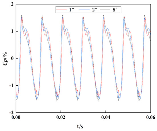 Figure 2 shows the time domain diagram of the pressure pulsation at different time steps for the monitoring points in the vaneless space. As shown, the pressure pulsation waveforms obtained at time steps corresponding to 1° and 2° are basically the same, while the waveforms obtained at time steps corresponding to 5° have more missing shapes. Considering the calculation accuracy and calculation time, 2° was chosen as the calculation time step, that is, the number of calculation steps in one rotation cycle is 180.