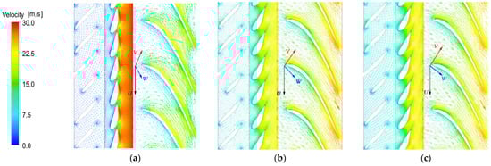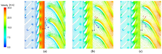 Velocity vector at the rated head. (a) OP1, (b) OP2, and (c) OP3.