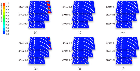 Cavitation volume fractions at rated head and maximum head. (a) OP1, (b) OP2, (c) OP3, (d) OP4, (e) OP5, and (f) OP6.