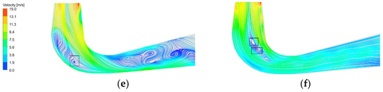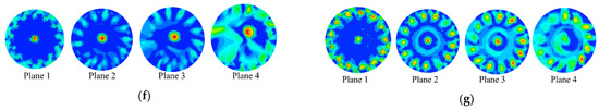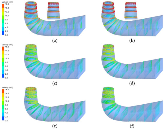 In Figure 6e,f, it can be seen that the outflow velocity is dominated by the relative velocity due to the increase in the flow rate. The inlet velocity in the draft tube was uniform, and its direction was perpendicular to the inlet surface. The low-velocity region is concentrated along the axis near the sidewall. There are 13 regular velocity changing cycles “increasing first and decreasing later” on the circumference, which is consistent with the number of runner blades. This indicates that the circumference is affected by the rotor-stator interaction, leading to an uneven velocity circulation at the inlet of the draft tube. This phenomenon disappears when the fluid flows downward, and the velocity on the sidewall is relatively low at the location where the curvature of the elbow section is large. There is an apparent low-velocity region in the diverging section, which may be resultant of the action of the vortex rope in the draft tube.