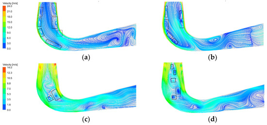 The flow characteristics at the center of the section of y = 0 of the draft tube were observed (see Figure 7) to further analyze the flow inside the draft tube. It was found that the flow characteristics at the inlet of the conical section have the characteristics of low central velocity, high velocity near the wall, and vortices between the two flow characteristics, which are marked in the boxes in Figure 7a,b, based on the observations of the small-load operating point condition. This shows that flow separation occurred in the conical section under this working condition, and the hydraulic loss was significant. As can be seen when observing the high-efficiency operating point condition, there is no apparent flow separation in the draft tube. However, there are vortices at the transition from the conical section to the elbow section, and the size is asymmetrical, as shown by the boxes in Figure 7c. Under this working condition, vortices with a certain eccentricity were generated. Vortices still exist under the maximum head condition, are concentrated on both sides of the axial line of the draft tube, and their distribution form is similar to Karman vortices, as indicated by the boxes in Figure 7d. A spiral vortex rope can exist under these conditions. Based on the observations of the large-load operating point condition, the absolute velocity of the fluid was dominant, and the effect of the rotating motion was small. The vortices mainly appeared in the elbow section, which may have been caused by the sudden expansion of the flow passage.