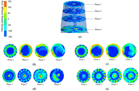 Figure 16 shows the trend of the axial velocity distribution in each layer according to the CFD calculations. The graph shows that the velocity distribution trends are close across the layers, but the extent of the low velocity region increases as the influence of the vortex rope expands. Furthermore, the velocity distribution trend in the second layer is similar to that of the experimental results.
