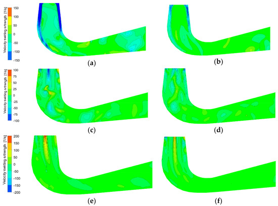 Vorticity distribution at the cross-section of the draft tube. (a) OP1, (b) OP2, (c) OP3, (d) OP4, (e) OP5, and (f) OP6.