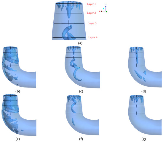 Vortex ropes in the conical section of the draft tube. (a) Local diagram, (b) OP1, (c) OP2, (d) OP3, (e) OP4, (f) OP5, and (g) OP6.