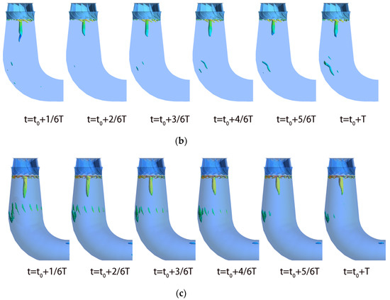 The vortex rope structures in the draft tube are connected to the hub in the upper part and have a certain eccentricity at the elbow section [35], which is consistent with the calculation results in this study. The area with regular variation patterns is mainly concentrated in the conical section, as shown in Figure 8 and Figure 10. After passing through the elbow section, the flow became complex and irregular, and the vortex rope in the draft tube and its influence only appeared before the elbow section.