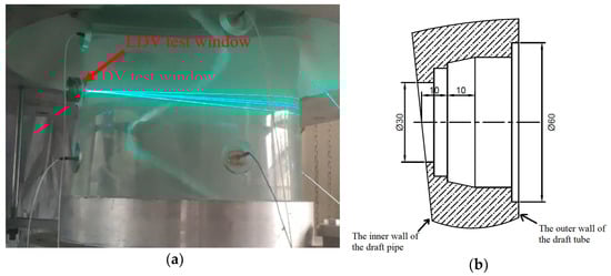 The laser Doppler velocimetry (LDV) technique is currently used to investigate the internal fluid velocity. Mulu et al. [25] used this method to study the flow field in the draft tube of a Kaplan turbine and compared it with numerical simulations. Vuillemard et al. [26] tested the runner exit flow field of a tubular bulb turbine using a two-dimensional LDV. Sundstrom et al. [27] performed LDV tests on three test sections of the tapered pipe section of the draft tube of the Francis turbine (Francis-99) and obtained the time-averaged velocity distribution and amplitude mean velocity of the test sections.