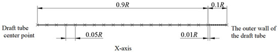 The monitoring points are arranged on the radial line between the center point of the test window and the center of the test section. The test radius is R. Twenty-nine test points are arranged. The distance between measuring points near the wall is 0.01 R, with a total value of 10 (including the wall points). Moreover, the distance between the remaining measuring points is 0.05 R, with a total of 19. The specific arrangement is shown in Figure 13.