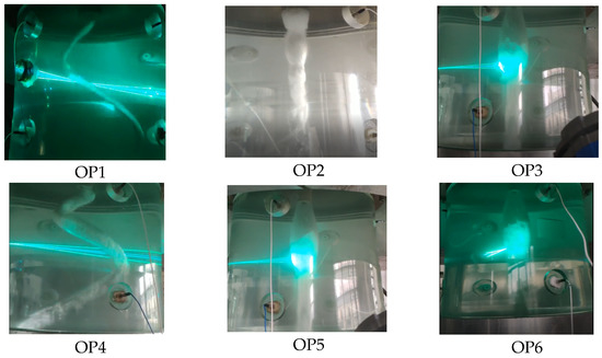 During the test, photographs of the vortex rope were taken at some of the operating points, as shown in Figure 14.