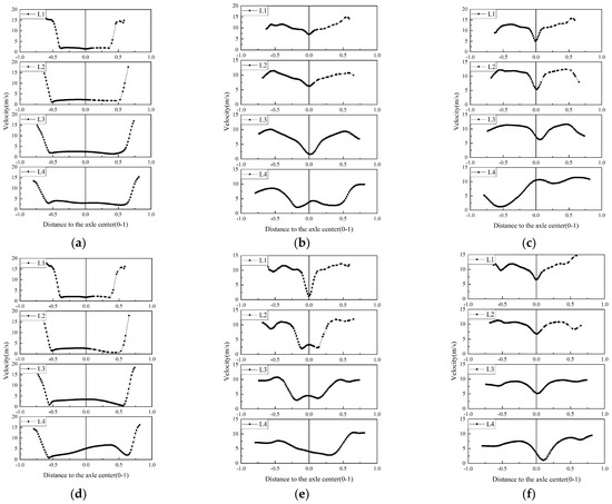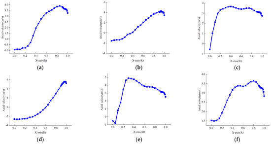 Velocities at the X-axis of the draft tube in CFD result. (a) OP1, (b) OP2, (c) OP3, (d) OP4, (e) OP5, and (f) OP6.