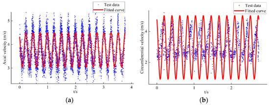 The transient velocities at the draft tube monitoring points were recorded during the LDV test and were used to analyze the effect of the draft tube vortex rope on the axial and circumferential velocities. Based on the fitting results, which showed strong regularity in the instantaneous variation of both the circumferential and axial velocities, the test results were subjected to the fast Fourier transform (FFT) and compared with the pressure pulsation characteristics to analyze the causes of the variation. Figure 17 shows the transient results obtained from the tests.
