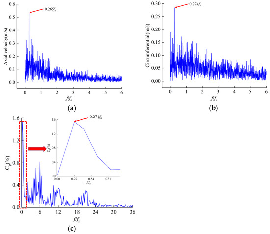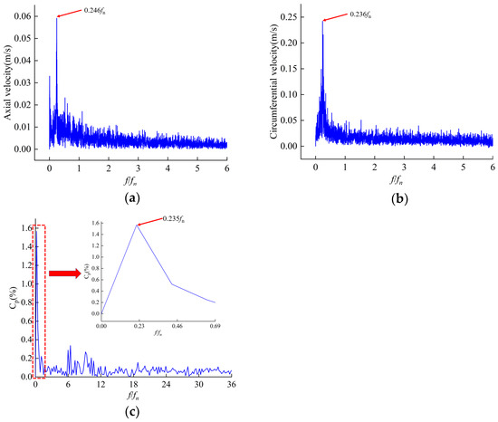 In Figure 18 and Figure 19, the main frequencies of the axial velocity, circumferential velocity, and pressure pulsations are very similar. Under these two small GVO operating conditions, cavitation vortex ropes appeared in the central region of the draft tube, as shown in Figure 14. It is generally accepted that the formation of the draft tube vortex rope is related to the characteristics of the runner outlet flow field due to the low flow rate under the small GVO conditions of a Francis turbine. As the rotating water entered the draft tube from the runner outlet, it interacted with the return flow in the draft tube. Simultaneously, the water flow was subjected to centrifugal forces and formed a spiral vortex rope that rotates around the axis of the draft tube. A gas cavity formed at low pressures in the vortex core. For the two operating conditions, OP1 and OP4, presented in Figure 15, the presence of the gas cavity caused the measured velocities in the central region to be close to zero.