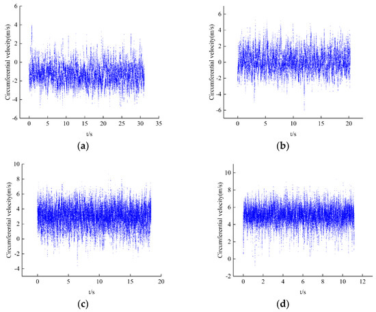 Circumferential velocity scatter diagram of OP1. (a) 0.05 R, (b) 0.2 R, (c) 0.4 R, and (d) 0.55 R.
