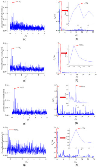 FFT results of circumferential velocity and pressure pulsation (LDV measuring point position is 0.2R). (a) Circumferential velocity of OP2, (b) pressure pulsation of OP2, (c) circumferential velocity of OP3, (d) pressure pulsation of OP3, (e) circumferential velocity of OP5, (f) pressure pulsation of OP5, (g) circumferential velocity of OP6, and (h) pressure pulsation of OP6.