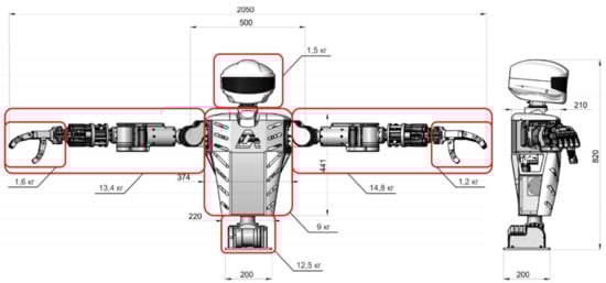 - Bogdanov, A.; Dudorov, E.; Permyakov, A.; Pronin, A.; Kutlubaev, I. Control System of a Manipulator of the Anthropomorphic Robot FEDOR. In Proceedings of the 2019 12th International Conference on Developments in eSystems Engineering (DeSE), Kazan, Russia, 7–10 October 2019; pp. 449–453. [Google Scholar] [CrossRef]