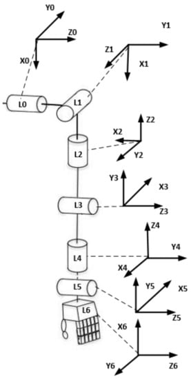 To solve the DKP we use a kinematic diagram of the anthropomorphic manipulators of the robot SAR-401 (Figure 5) and the notation and methodology of Denavit–Hartenberg [16]. We will consider the left manipulator of the robot. Since this manipulator has only rotational joints, the relative location of neighboring links will be determined by the angular variable .