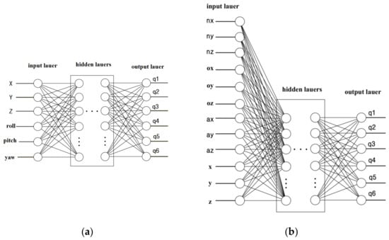 The main direction of a NN design for solving the IKP is related to the influence of structural parameters (the number of hidden layers and the number of neurons in each hidden layer), iteration steps, and a training dataset on the performance of the IKP solution approximation [9,10]. At the same time, it is not recommended to complicate a NN configuration, because this leads to a significant increase in the number of iterations to achieve the required learning goal [11]. The training dataset for a NN design is obtained either by solving a direct kinematics problem (DKP) or by experiments.