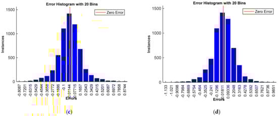 Error histogram as the difference between the target and predicted values when training a neural network using: (a) the Levenberg–Marquardt (trainlm); (b) the Bayesian regularization backpropagation (trainbr); (c) scaled conjugate backpropagation gradient (trainscg); (d) resilient backpropagation (trainrp).