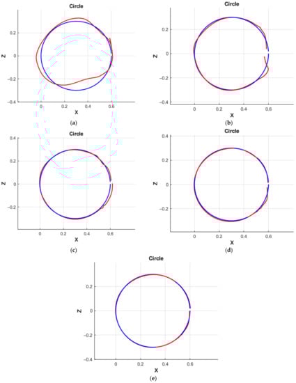 Simulation of the movement of the manipulator along a circle: (a) MATRIX NN 1; (b) MATRIX NN 2; (c) MATRIX NN 3; (d) MATRIX NN 4; (e) the correctional NN.