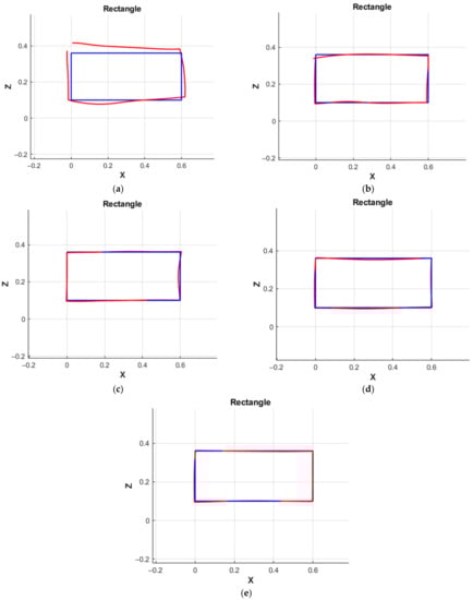 Simulation of the movement of the manipulator along the rectangle: (a) MATRIX NN 1; (b) MATRIX NN 2; (c) MATRIX NN 3; (d) MATRIX NN 4; (e) the correctional NN.