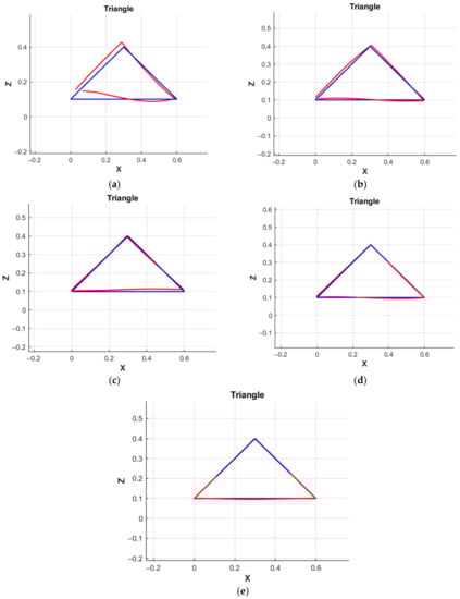 Simulation of the movement of the manipulator along the triangle: (a) MATRIX NN 1; (b) MATRIX NN 2; (c) MATRIX NN 3; (d) MATRIX NN 4; (e) the correctional NN.