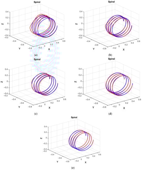 Simulation the movement of the manipulator in a 3D spiral: (a) MATRIX NN 1; (b) MATRIX NN 2; (c) MATRIX NN 3; (d) MATRIX NN 4; (e) the correctional NN.