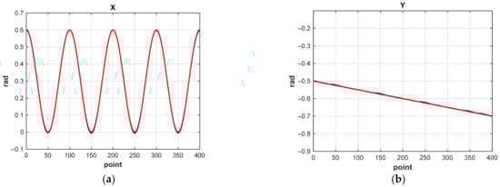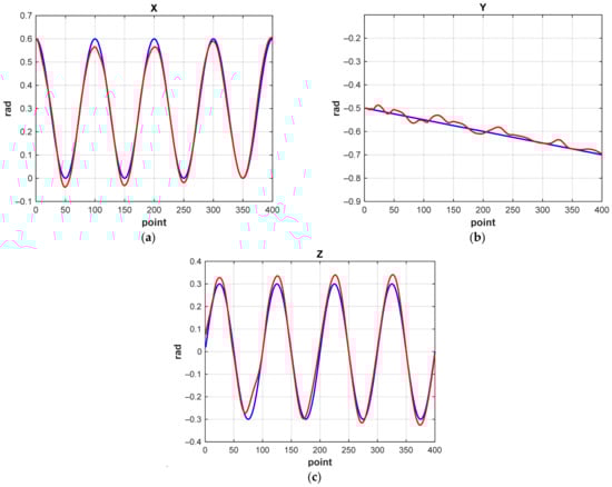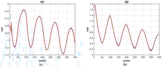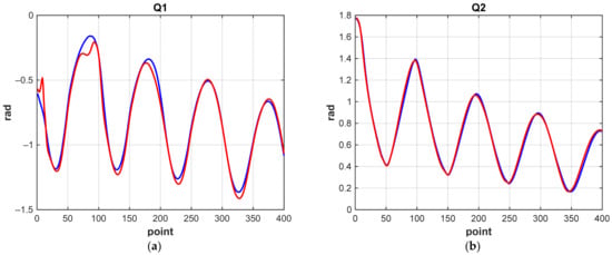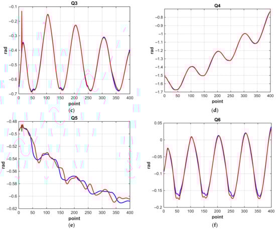 Certain conclusions can be drawn by analyzing changes in the generalized coordinates of the manipulator, which explain which joint makes the greatest contribution to the error. Figure 21 and Figure 22 show the corresponding graphs. As before, the solution of the neural network is marked in red, and the construction of the trajectory using the numerical solution of the IKP is marked in blue.