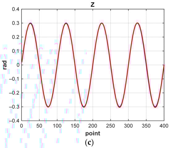 Graphs of coordinate changes during the movement of the manipulator in a spiral in 3D (the correctional NN): (a) along the X-axis; (b) along the Y-axis; (c) along the Z-axis.
